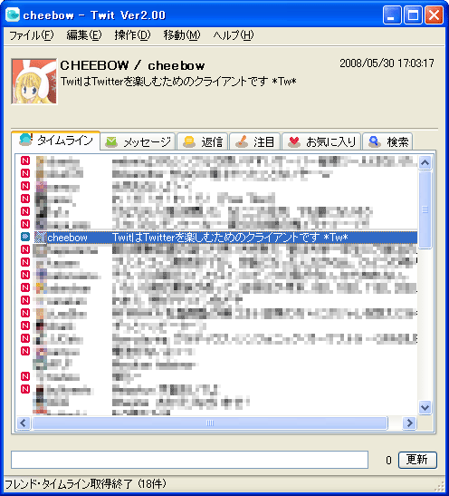 お気に入りユーザのIDでフィルタリングされたステータスの一覧が表示されます。